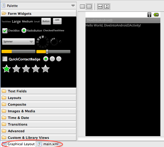 Let’s create a new project “DiveIntoAndroid3” and complete the basic rituals discussed in the earlier post. To construct the UI you will use the main.xml file present in the res/layout folder. The UI design of Android applications are present in an XML file similar to Flex, Sliverlight etc. Opening the main.xml file will provide you a template, where you can drag and drop the UI components from the palette. You can switch between the design view and the code by clicking the tabs ‘Graphical Layout’ and ‘main.xml’ below.